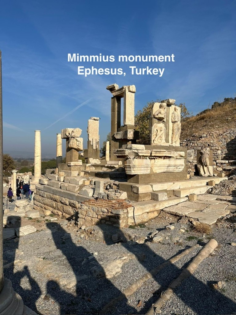 El monumento de Memmius tiene un origen sangriento. Lo hizo construir un siglo antes de cristo Memmius, un bisnieto del dictador y héroe romano Sulla. La historia es que los ciudadanos de Éfeso estaban mamados de los altos impuestos que tenían que pagarle a Roma. Pero necesitaban un milagro para poder pelear y acabar con el dominio romano. El milagro fue que se les apareció Mithridates, el emperador del reino de Pontus en el norte de Anatolia (hoy Turquía). Mithridates era un verdadero “jodido hijueputa” que odiaba a los romanos y se la pasaba peleando con ellos para echarlos de Anatolia. Su motto era “Asia para los asiáticos” (“America First” de los trumpistas de MAGA versión Anatolia). Tal vez recuerden el cuento que es cierto de que fue Mithridates a quien se le ocurrió tratar de volverse inmune al arsénico ya que a su padre lo habían envenenado. Para lograrlo fue tomando dosis sub letales del veneno hasta hacerse inmune, práctica que aún se llama por “mithridatismo” en recuerdo de su inventor. En todo caso, el tipo tomó como bandera el caso de la población de Éfeso y allí y en otras partes mató a unos 80.000 romanos, acabando con el dominio de Roma en la ciudad. Pero pronto llegó el héroe Sulla y reconquistó Éfeso para los romanos en una batalla que ocurrió en el año 87 AC. El monumento se hizo entonces para recordarles a los ephesianos de esa batalla. En el monumento aún se ven las imágenes talladas de Sulla y Memmius.