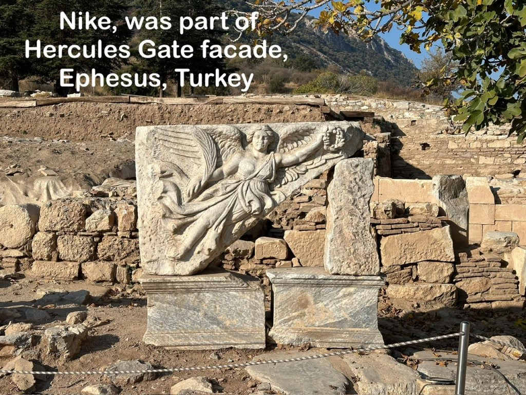 Hasta llegar a la puerta de Hércules, estrecha a propósito para impedir el paso de cosas grandes que pudieran traer los invasores. Originalmente tenía un arco muy decorado con imágenes talladas. Esta pieza de la diosa Nike hacía parte de ese arco. Allí en esa puerta, y cuesta abajo empieza una avenida o calle de Curetes, con cosas increíbles a cada lado: mansiones, fuentes, templos. Los Curetes eran los sacerdotes que usaban esa calle en sus procesiones. Como dato aparte, sospecho que el termino “cura” que usamos en español para los sacerdotes, viene de esa palabra de orígen griego (Kouretes).